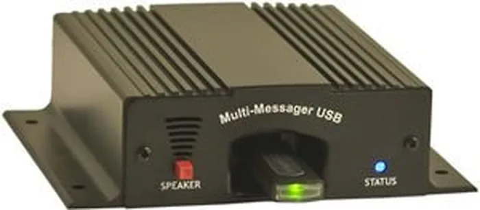 - Nel-Tech Labs Multi-Messager USB digital message repeater- Solid-state digital message repeater that installs easily into any messaging application that requires triggered or timed message play- Will play up to 99 MP3 files encoded in a wide variety of bit rates from 8Kbps up to near CD-quality rates of 128Kbps- Messages are triggered either by the eight contact inputs on the rear of the unit or utilizing it's built-in interval timer circuit- A wide variety of features such as an active output can be tied to LEDs or relays for activation when a message is playing or a stop trigger to terminate message play- Built-in 12VDC auxiliary output allows motion detectors or heat sensors to be powered from the unit- All incoming triggers can be configured for normally-open or normally-closed triggering, as well as play once or play continuous- A rotate feature can be activated on the unit allowing for a different message to be played each time the main trigger is activated- Programming of features is extremely easy by using the manual and setting the DIP switches on the bottom of the unit- Background music can be fed through the unit and when a message is triggered the built-in digital fader will fade down the music and play the selected message. After the message is played the background music will fade back up to its previous level.- Each Multi-Messager USB is built to exacting quality standards using state-of-the-art assembly equipment for outstanding reliability and years of dependable service- Plays MP3 files from USB flash drive- Up to 4GB flash drives supported- No drivers or special software needed- Playback quality up to 128Kbps- Store up to 99 messages- Triggered and/or timed playback- Active output indication trigger- Auxiliary 12VDC output for wiring sensors- Built-in monitor speaker- LED status indicator- Exceptional manufacturer dealer support- 5 Year manufacturer's parts and labor warranty- Made in the USANLMMSGUSBWDRIVE