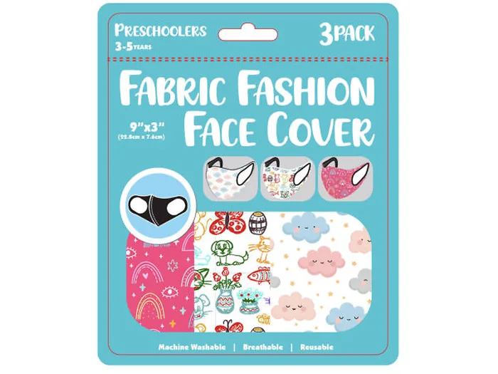 These cute design masks will have your preschooler looking adorable, while also protecting them and those around them. Each mask is made of soft material making it easy to breathe and effortless to wear. There are 3 masks per package - they are safe and ready to use. Made of 95% polyester and 5% spandex. Masks are reusable and washable so you'll always be ready when safety is needed. Comes in 3 designs per pack - pink rainbow, child drawing, and sleepy pastel clouds. Masks come packaged together inside a sealed hanging bag. Mask measures 9" x 3".