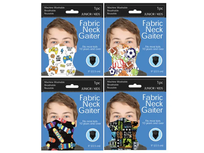 Trendy with awesome patterns, the Tween Boys Neck Gaiter is a multi-functional way to not only protect your child but also adds a flair of style. Breathable and easy to wear, the neck gaiter can be worn as a face cover, bandana, beanie, headwrap, pirate cap, scarf, and more. The neck gaiter is perfect for running everyday errands but is also great for outdoor activities such as fishing, hiking, camping, motorcycling, yoga, and to wear while traveling. The gaiter is made out of 98% polyester and 2% spandex making it lightweight and easy to carry in your purse or pocket. Comes individually wrapped inside a sealed polybag. Comes in 4 assorted styles - video game, sports, skateboard, and motorbiking. One size most. Measures approximately 9". Comes packaged individually inside a sealed hanging bag.