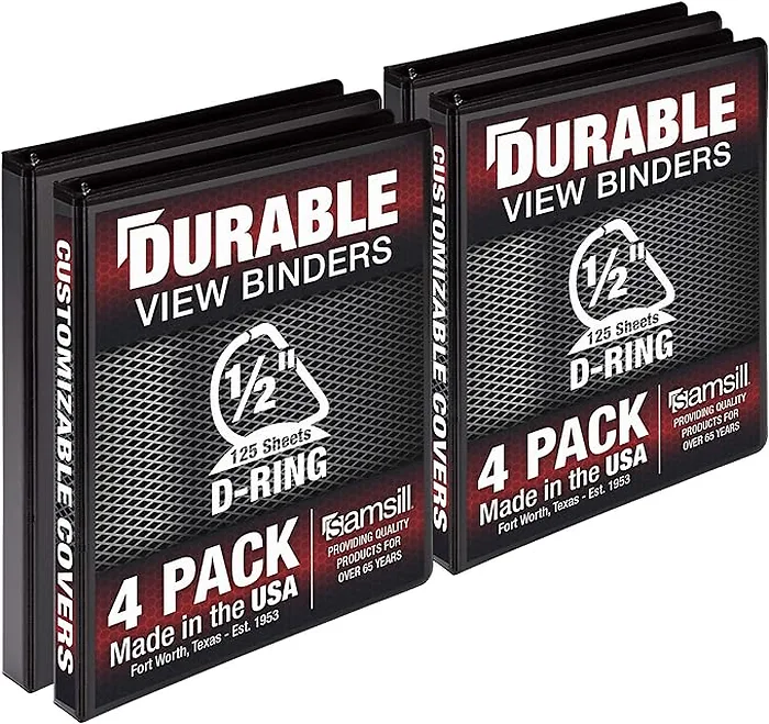 Samsill Durable 0.5 Inch Binder, Made in the USA, D Ring Binder, Customizable Clear View Binder, Black, 4 Pack, Each Holds 125 Pages