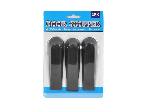 Keep doors open and prevent door knobs from damaging drywall with this 3-piece Door Stoppers Set. Each pack comes with 2 angled plastic door stoppers and 1 metal spring stopper (hardware included). Angled stoppers measure approximately 1 1/4" x 4 3/4" and spring stopper is 3". Comes packaged in a blister pack.