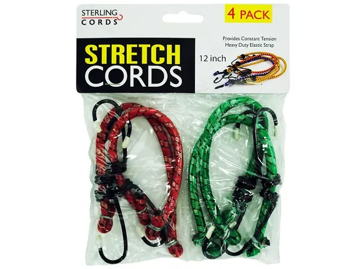 The Versatile Stretch Cord Set provides an array of practical uses for your home, yard, and garage. Each durable stretch cord features vinyl-coated hooks for a secure grip, making them perfect for bundling, holding, or securing various items. The set includes four stretch cords, with two vibrant red and two fresh green cords. For convenience, these cords come packaged in a sleeved poly bag with an attractive header card. Each cord measures 12 inches.