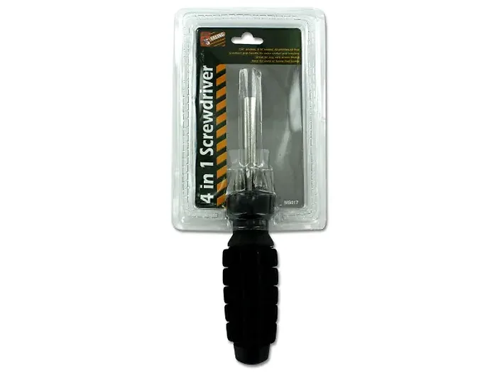 A perfect addition to the toolbox, this 4 In 1 Screwdriver Set features a cushion grip handle for extra comfort and traction. Ideal for keeping organized, bits fit conveniently in the handle. Tips include: 1/4" slotted, 3/16" slotted, #2 phillips and #2 hex. Measures approximately 7" long without tips. Comes packaged in a clam shell.