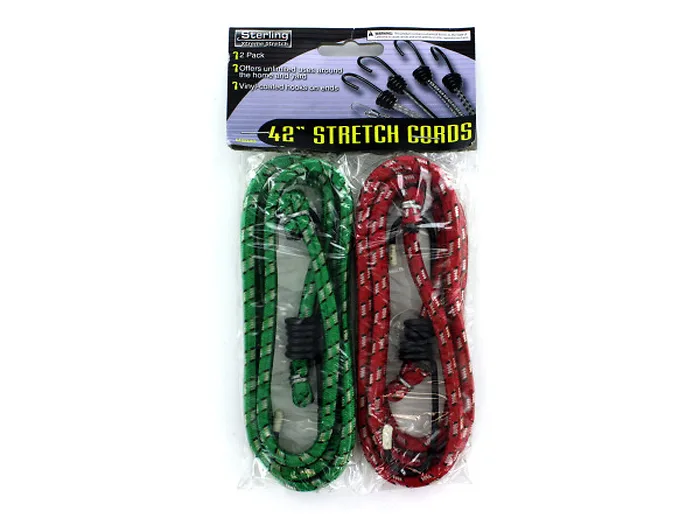 A home and auto essential, this 2-piece Elastic Stretch Cord Set offers unlimited uses in cars, garages, homes, gardens and more. Each cord has vinyl covered metal hook ends. Set comes with 2 stretch cords - one green and one red. Cords measure approximately 42" long. Comes packaged in a poly bag with a header card.