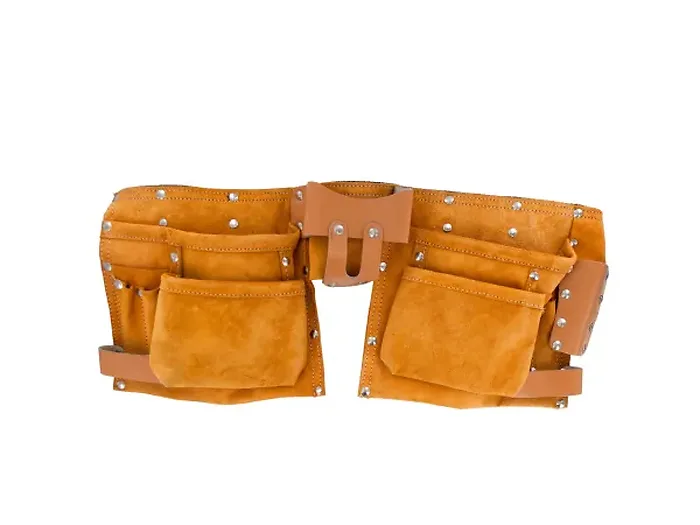 Crafted from durable leather, the belt features heavy stitching and metal rivet reinforcements for long-lasting wear. It measures approximately 24" x 8.75" x 2" with an adjustable belt length up to 44". This tool belt comes packaged in a poly bag for easy storage and transport.
