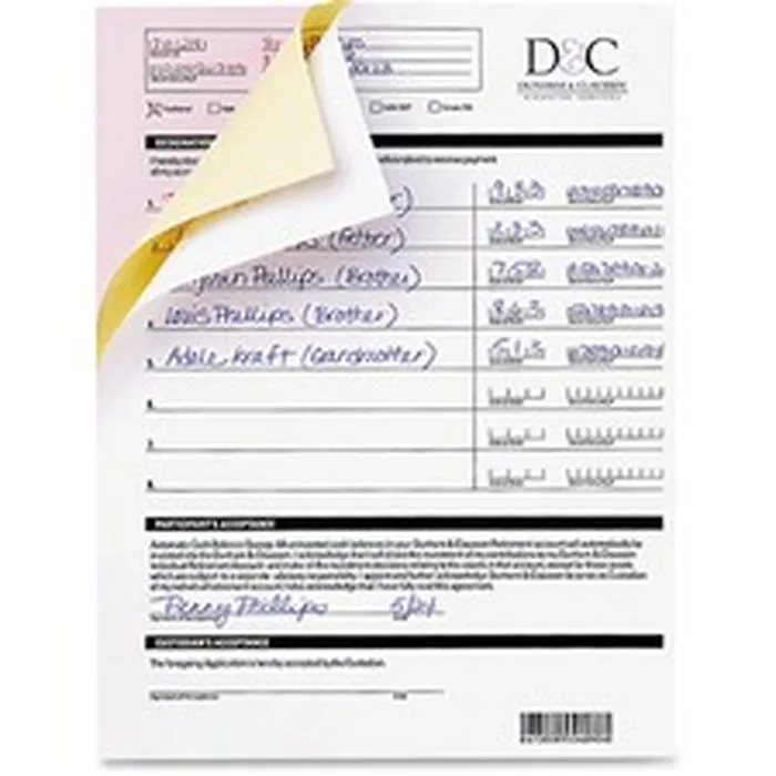 Three-part carbonless paper is specifically designed for use in digital monochrome and color printing environments where high friction, roller pressures and fuser temperatures are present. Uniquely coated sheets eliminate the need for negatives, stripping, platemaking, press make-ready, press-inking and printing. Dye-coated paper is perfect for use in business forms and other applications where pressure-responsive mated paper is required.