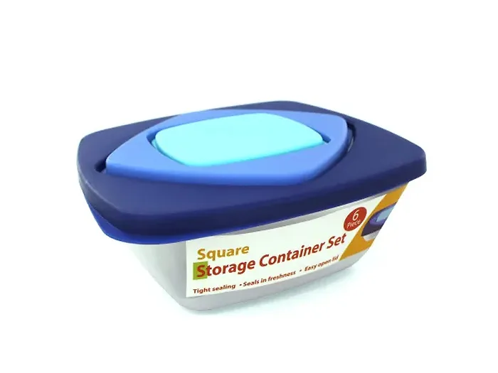 This 3 pack square storage container set includes three durable and clear plastic containers with matching lids. Each container's clarity allows you to easily see the contents inside, while the vibrant lids come in three shades of blue that progressively darken with size. The capacities are as follows: the large container holds 4 cups, the medium container holds 2 cups, and the small container holds about 7 ounces. Each container features a tight seal to keep your food fresh while remaining easy to open. The dimensions of the containers are 3 1/4" x 3 1/4" x 2 1/8" for small, 4 3/4" x 4 3/4" x 2 1/4" for medium, and 6 5/8" x 6 5/8" x 2 1/2" for large. This set comes conveniently shrink wrapped for easy display.