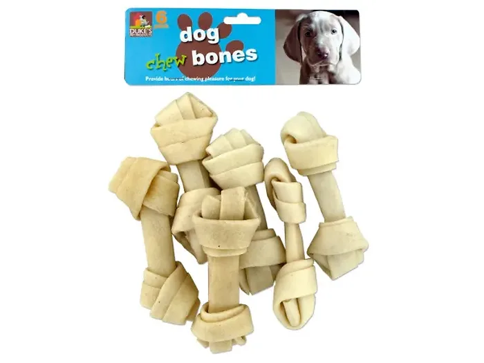Keep your furry friend entertained and healthy with our Premium Knotted Dog Chew Bones. Designed for hours of chewing pleasure, these bones help maintain your dog's dental hygiene by promoting clean teeth and healthy gums. Each pack includes 6 high-quality chew bones, each measuring approximately 4 3/4 inches, and conveniently packaged in a poly bag with header card.