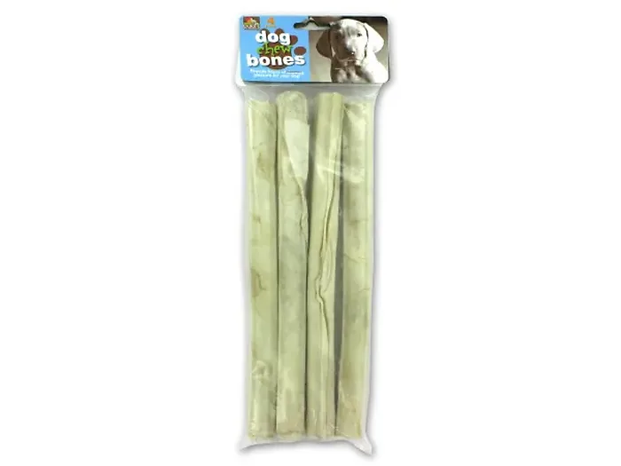 Each pack includes four rolled and pressed chews, packaged conveniently in a poly bag with a header card. Each roll measures approximately 10 inches long, perfect for small to medium-sized dogs.