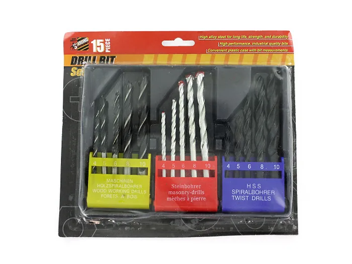 A great addition to any toolbox, this 15-piece Assorted Drill Bit Set will provide a drill bit for every drilling job. Set includes five each of wood working drill bits, masonry drill bits and twist drills. Made from high alloy steel for long life, strength and durability. Each set of five drill bits comes in its own plastic case with bit measurements. Comes packaged in a blister pack.