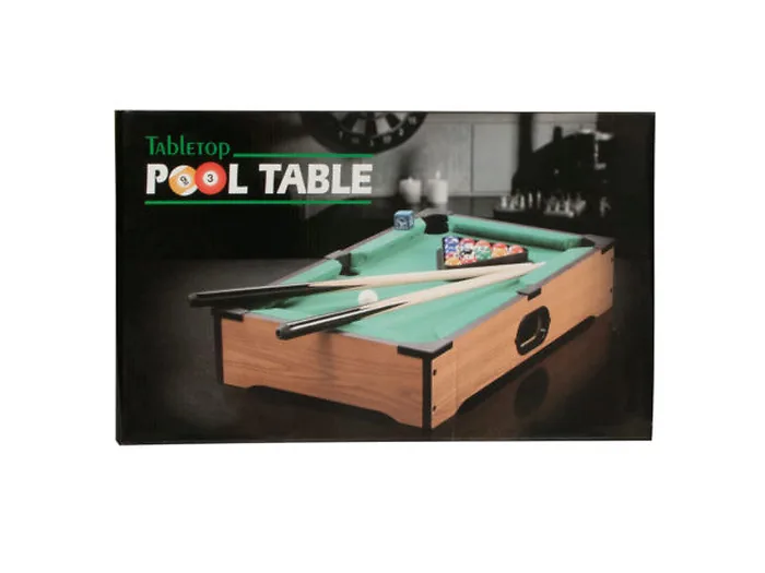 Why give up an entire room to a pool table when you can use this fun Tabletop Pool Table set? Fully featured set includes the table (20" x 12.2 x 3.75"), 15 colored balls, 1 cue ball, 2 pool sticks, 1 cube of chalk and a triangle. Table is made of composite wood with polyester covering. Comes packaged in an individual box. Box measures approximately 20.5" x 4" x 12.75".