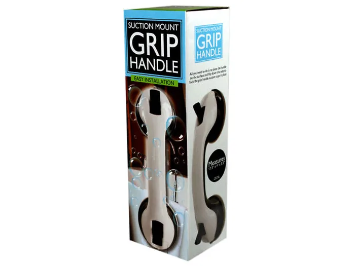Stay safe while bathing with this Suction Mount Super Grip Bath Handle featuring a durable plastic grip with suction cups, push levers and a contoured handle. Fits any shower or bath and mounts to any non-porous surface. No need for holes, screws or tools! It can be placed in horizontal or vertical positions. Handle is white with dark green levers. Measures approximately 11.5" x 4" x 3.5". Comes packaged in an individual box. Box measures approximately 4" x 3.25" x 12".