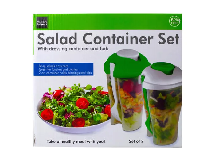 Keep salad or fruits fresh, cool and crisp with this 2-piece Salad Container Set with Dressing Containers & Forks featuring transparent plastic containers with an easy grab and ergonomic design. Dressing container holds 2 ounces of dressing, dips and more! Each container measures approximately 8" tall. BPA free. Comes packaged in an individual box. Box measures approximately 9" x 5.25" x 8.25".