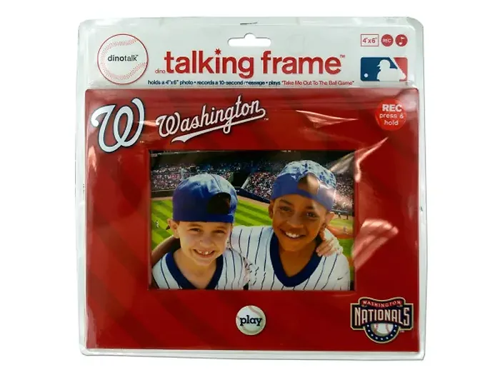 This Washington Nationals recordable photo frame is the perfect way to cherish your favorite memories while showing off your team pride. Add your personal 10-second audio recording, followed by a classic rendition of 'Take Me Out to the Ballgame.' This item makes for a thoughtful gift for any Nationals fan and is designed to hold a 4" x 6" photo.