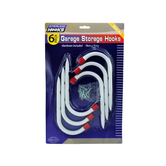 Save space and your sanity with this set of garage storage hooks! This value pack comes with 6 large garage hooks that are great for organizing bikes, bags and more. Every pack comes with 6 metal hooks along with the necessary hardware. Hooks measure approximately 6" long with a 3" hook section. Comes packaged in a blister pack.