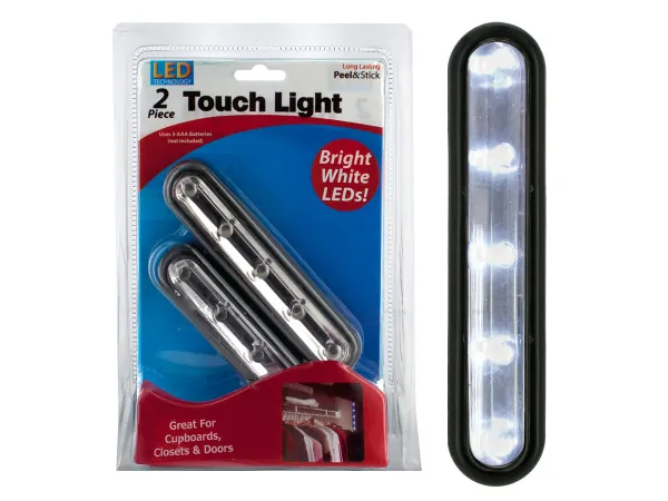 Illuminate cupboards, closets and other small spaces that need extra light with this convenient Peel & Stick 5-LED Touch Light. No need to scrounge around for a flashlight - use the LED lights instead! Light has an adhesive back making it easy to install. Just press down lights to turn on and off. Lights use 3 "AAA" batteries (not included) and come in red only. Light measures approximately 7" x 1 3/4" x 3/4". Comes packaged in a clam shell.