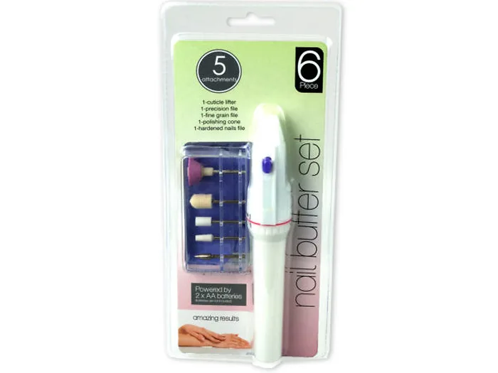 Get amazing results with this Battery Operated Nail Buffer Set - the perfect and convenient way to keep up with manicures at home! Buffer is easy to use, lightweight and portable. Ideal for both natural and artificial nails. Also includes 5 attachments for filing, shaping, sculpting and polishing. Easily store attachments inside the provided plastic case. Keep all items together in the included purple drawstring bag. Buffer uses 2 "AA" batteries (not included). Buffer measures approximately 6 1/2" long. Comes packaged in a clam shell.