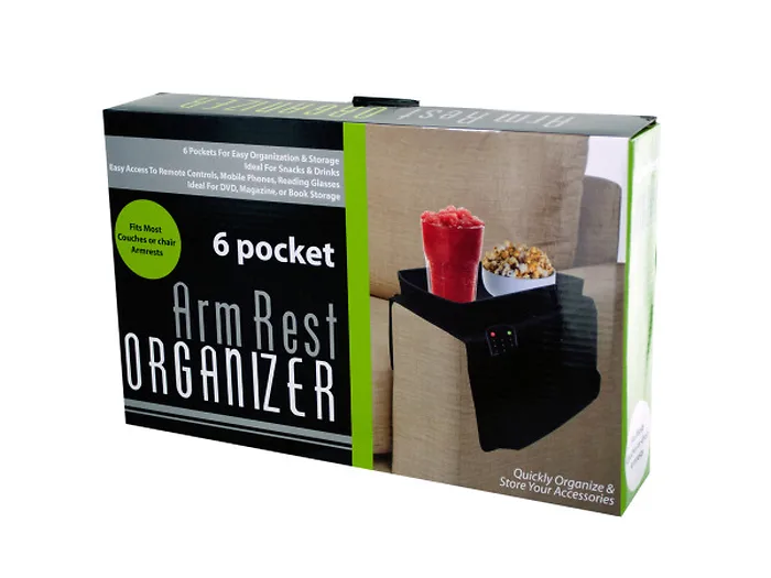 Easily organize and access remote controls, cell phones, reading glasses or magazines with this arm rest organizer. The arm rest organizer has a hard table style center for snacks or drinks with one large hanging side for magazines and one multi-pocket side for remote controls, etc. Great for movie nights! Organizer fits most couches or chair armrests. Approximate measurements: 7.25" x 12" center piece, 12" wide x 6.5" side with 11.75" x 6" pocket and the other side is 11.75" wide with 3 - 6" x 3.75" pockets. Comes packaged in an individual box. Box measures approximately 13" x 2.25" x 8".