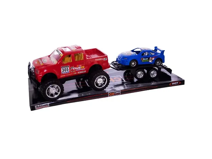 Friction-Powered Truck and Trailer Set with Race Car