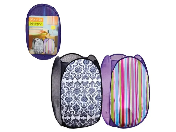 Constructed from 100% nylon, this hamper is both durable and easy to clean. It measures approximately 10.5" x 11.5" in diameter and 22" deep, and it is available in assorted colors. Perfect for keeping your laundry neatly stored until wash time!