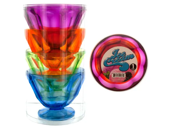 Each pack includes four vibrant plastic ice cream cups in purple, blue, green, and orange. The cups are beautifully packaged in a transparent box with a decorative label, ready to impress your guests!