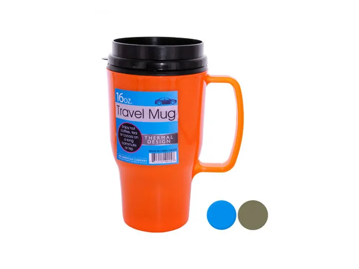 Enjoy hot coffee, tea or cocoa on a long commute or trip with this 16-Ounce Thermal Travel Mug featuring a durable plastic mug with a pop top and a comfortable handle. Comes in three bright colors. Measures approximately 6.75" x 5". Comes loose with a UPC sticker.