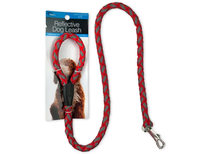 Be clearly seen and safe when walking your dog with this Reflective Dog Leash. Heavy duty woven nylon with a bright reflective strip makes this leash strong, durable and very noticeable. Practical design features a metal collar hook and plastic-reinforced hand loop for extra durability. Measures approximately 45" long. Comes in assorted colors. Comes packaged to a tie card.