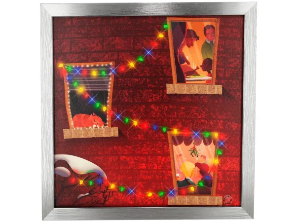 Crafted from high-quality canvas and framed with a sleek silver plastic, this charming piece not only adds a festive touch but also serves as a joyful centerpiece. It's easy to set up, ready to hang, and comes complete with 2 cell batteries included, so you can enjoy the holiday spirit right away.
