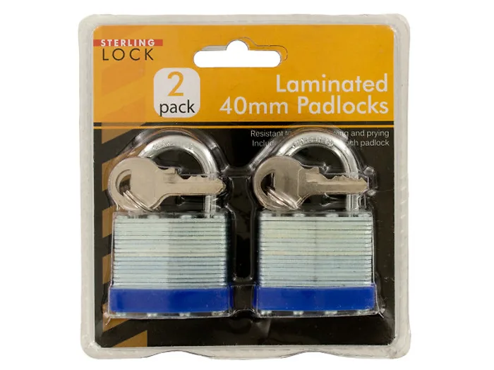 Keep your valuables safe and secure with this set of two Laminated 40mm Padlocks. They are resistant to cutting, sawing, and prying. Includes two identical keys for each padlock. Each lock measures approximately 2.5" x 1.5" x 1". Comes packaged in a hanging clam shell. Package measures approximately 5" x 5" x 1.5".