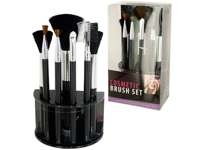 Complete with 7 different cosmetic brushes, this set is all you'll need to create perfectly polished looks. Includes: 1 large blush brush, 2 medium blush brushes, 1 shadow brush, 1 lip liner brush, 1 sponge tip shadow brush, 1 eyebrow brush and all of it comes with a convenient stand. Comes packaged in an individual box.