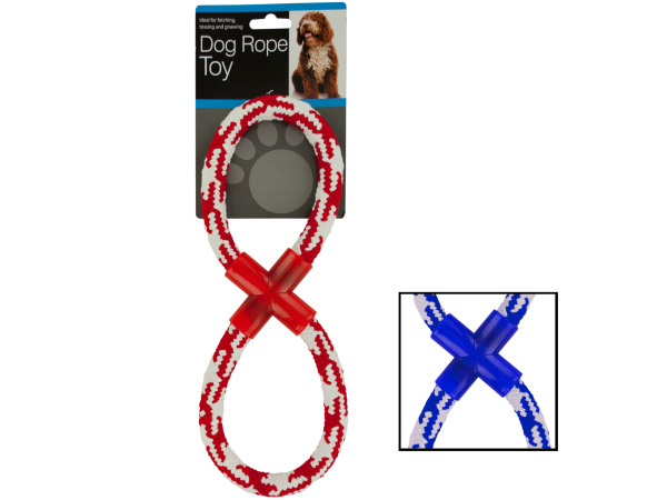 The Durable Figure Eight Rope Toy provides endless entertainment for one or two dogs. Its thick, twisted cotton rope is crafted into a figure eight shape, reinforced with a sturdy plastic four-way connector for added durability. Not only is this toy fun to play with, but it also helps clean dogs' teeth as they chew and tug. Ideal for interactive play sessions, this rope toy measures approximately 15.5" x 5.5" x 1.25" and comes with a convenient UPC tag.