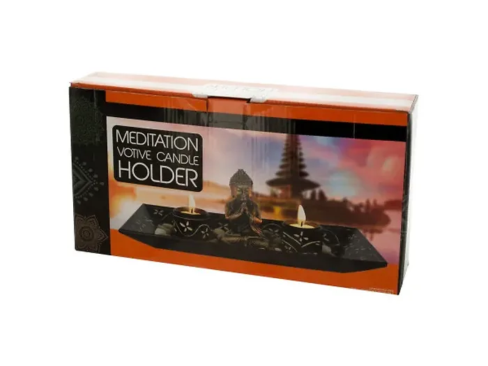 Add a touch of tranquility to your home with the Elegant Buddha Candle Holders with River Stones Set. This beautiful set features a golden Buddha figure, two cylindrical candle holders, and a rectangular base made of composite wood, finished in sleek black. The decorative etched designs showcase an Eastern Enlightenment theme, creating a perfect ambiance for meditation or relaxation.