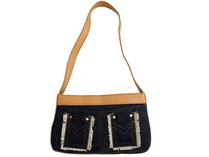 This stylish Blue Denim Handbag with Tan Trim and Fringed Pockets is perfect for everyday use. Its unique design resembles the back of a pair of jeans, adding a fun touch to your outfit.