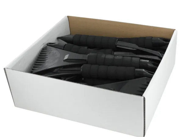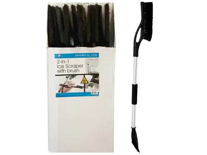 This Deluxe 2-In-1 Ice Scraper and Snow Brush Set is essential for efficient winter weather preparation. Designed for automobiles, it features a robust 4.25" wide plastic scraper on one end that easily removes ice and snow, while an 8.25" heavy-duty bristle brush on the other end assists in clearing away accumulated snow.