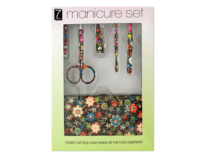 Great for travel or home use, this pretty 7-piece Manicure Set with Stylish Floral Carrying Case has everything you need for a perfect manicure. Includes a nail file, tweezers, cuticle pusher & cleaner, cuticle scissors, 2 nail clippers and a carrying case. All tools are made of strong metal. Comes packaged in an individual window box. Box measures approximately 5.5" x 1" x 7.875".