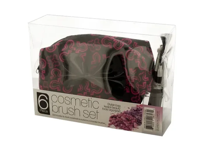 This 6-piece Makeup Brush Set comes with everything you need for flawless makeup application. It includes specialized brushes for lips, blush, eyeshadow, eyebrows, and concealer, all neatly packed in a stylish 7.5" x 4.75" horseshoe print bag. The bag features a shiny black bow and a secure zipper closure, making it easy to stay organized.