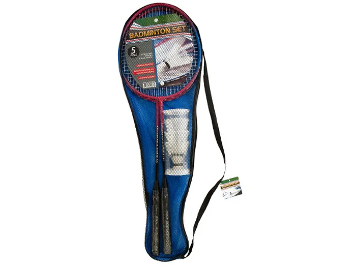 Great for backyard fun, this 5-piece Badminton Set with Carry Bag includes everything you need to start playing: 2 colorful nylon stringed rackets and 3 durable white plastic shuttles. Set comes inside a mesh and cloth carry bag with a zipper and strap. Comes in assorted colors. Comes packaged with a hang tag.