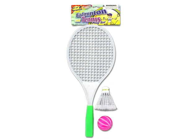 Great for all ages, this 2 in 1 Badminton and Tennis Game Set can be played virtually anywhere. Fun design features brightly colored rackets with nylon mesh faces and comfortable foam handles, a rainbow birdie and a striped ball for tennis. Includes 2 rackets, 1 ball and 1 badminton bird. Comes packaged in an individual box. Box measures approximately 6.75" x 1.5" x 13.5".