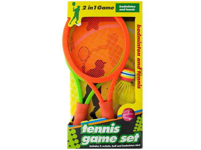 Great for all ages, this 2 in 1 Badminton and Tennis Game Set can be played virtually anywhere. Fun design features brightly colored rackets with nylon mesh faces and comfortable foam handles, a rainbow birdie and a striped ball for tennis. Includes 2 rackets, 1 ball and 1 badminton bird. Comes packaged in an individual box.