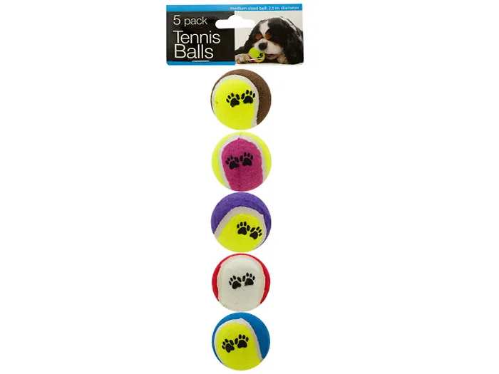 Perfect for tossing, fetching and chewing, this 5-piece Dog Tennis Balls Set features felt tennis balls in various colors with paw print accents. Balls measure approximately 2.5" in diameter. Comes packaged in a poly bag with a header card.