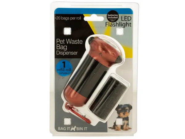 Perfect for night walks, this convenient Pet Waste Bag Dispenser LED Flashlight features an LED flashlight that doubles as a waste bag dispenser with a carabiner clip. Includes roll inside flashlight plus a refill roll with 20 bags per roll. Measures approximately 4.5" long. Batteries included. Comes packaged in a blister pack.