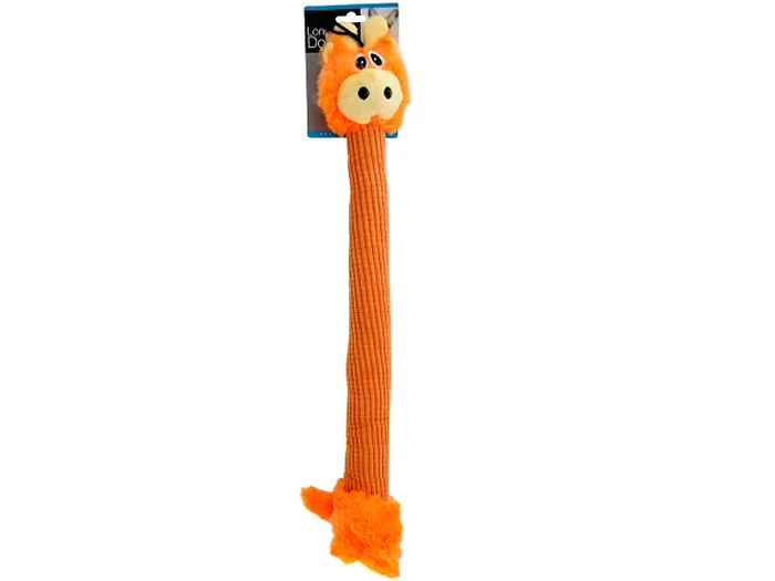 Dogs will love this unique Long Body Giraffe Plush Dog Toy featuring a friendly giraffe with an extra long corduroy body and a plush head, feet and tail. Great for tossing and fetching. Measures approximately 25.5" long. Includes a nylon hook at the top. Comes packaged on a hanging panel.