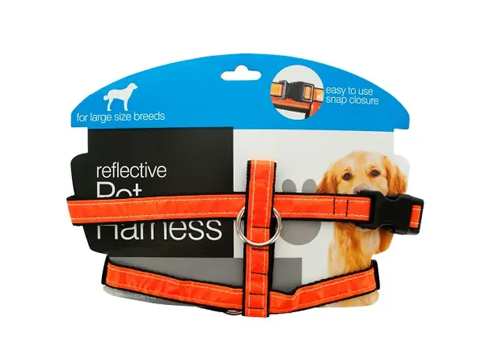 Ensure the safety and visibility of your furry friend during walks with our Adjustable Reflective Dog Harness. This harness features a bright orange reflective covering that enhances visibility in low-light conditions, ensuring that your pet is seen by others. It is designed for comfort and security with a durable, adjustable fit and an easy-to-use snap closure. The harness is available in three sizes: small (13"-23"), medium (17"-27"), and large (19"-31").