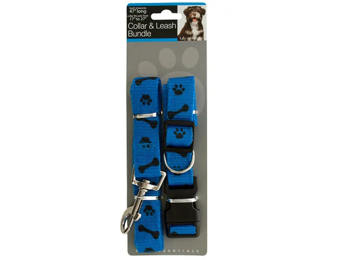 Set of 6Made from metal, plastic and nylon47 in. LCollar: 17 in. to 27 in.Walk your dog in classic style with this Paw and Bone Print Collar and Leash Bundle Set featuring a durable, fully adjustable blue nylon collar with a paw and bone print and an easy to use snap closure, and a matching leash with a metal hook attachment. Comes packaged to a tie card.