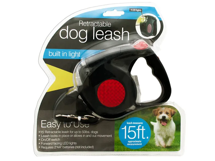 Safely light the way with this easy to use Retractable Dog Leash with LED Light featuring an approximately 15' retractable leash for dogs up to 50 pounds and 4 bright, forward facing LED lights operated with an on/off switch. Leash locks in place or allows in and out movement. Requires 2 'AA' batteries (not included). Comes packaged in a clam shell.