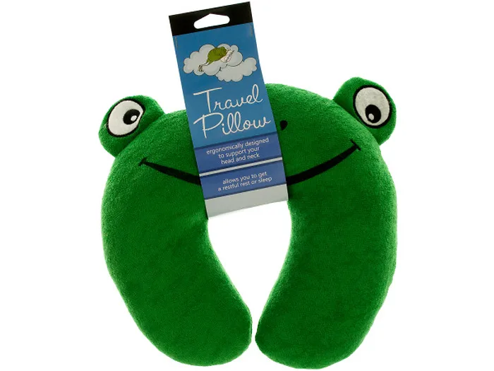 Perfect for travel and more, this cute Terry Frog Travel Pillow features a u-shaped green terry cloth pillow made to look like a frog with big extended eyes. Ergonomically designed to support your head and neck, this pillow allows you to get a more restful nap or sleep. Measures approximately 10.5" x 2.75" x 10". Comes packaged with a wrap around hang tag in a poly bag.