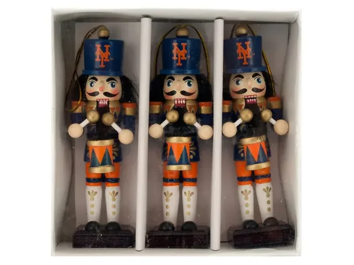 Celebrate your team pride during the holidays with this charming 3-piece MLB Licensed New York Mets Nutcracker Ornament Set. The set features beautifully painted wooden nutcrackers in vibrant blue, orange, gold, and white, each adorned with the Mets logo on their hats and gold hanging cords. Each nutcracker measures approximately 5" tall and is securely mounted onto a square wooden base. Perfect for adding a festive touch to your home décor or for gifting to a fellow fan, this set comes packaged in an individual window box.