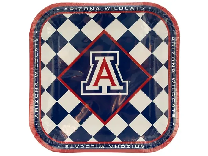 Celebrate your Arizona Wildcats spirit with this vibrant 8-piece lunch plates set. Designed for both parties and everyday use, these square plates feature a stylish blue and white checkered pattern with striking red accents. Each plate prominently displays the Arizona Wildcats logo and the phrase 'Arizona Wildcats' along the edges.