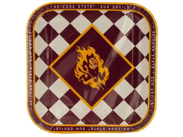 Elevate your dining experience with the Arizona State Sun Devils Lunch Plates Set. This set of 8 square plates showcases a stylish maroon and white checkered design highlighted with yellow accents. Each plate proudly displays the Sun Devils logo and the words "Arizona State Sun Devils" around the edges. Perfect for game days, parties, or everyday meals, these plates measure approximately 9 inches by 9 inches and come shrink wrapped for easy handling.