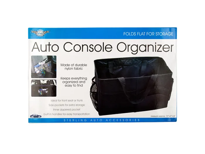 Ideal for front seats or trunks, this convenient Auto Console Organizer keeps everything organized and easy to find. Made of durable nylon fabric, this organizer features a variety of pockets for extra storage, an inner zippered pocket and built-in handles for easy transportation. Hook and loop fasteners keep organizer in place on most auto mats and carpets. Folds flat for storage. Measures approximately 13" x 8" x 8". Comes packaged in an individual box.